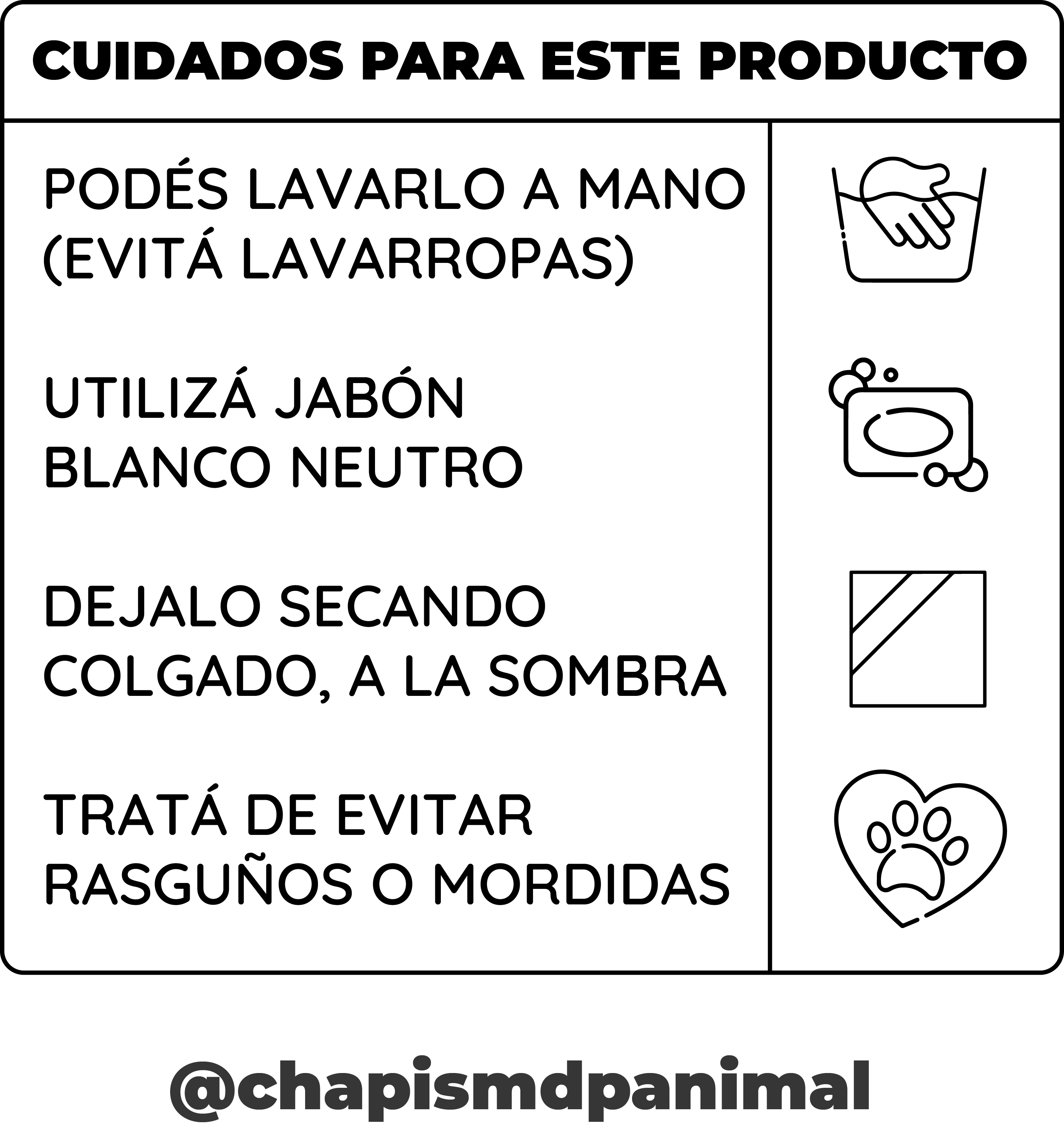 Si el talle que elegiste no es el correcto, podemos hacer el cambio de la siguiente manera: reutilizamos la chapita -se descuenta el costo de la misma- y se abona únicamente el precio del nuevo collar/arnés (en su totalidad, no la diferencia de un talle a otro).